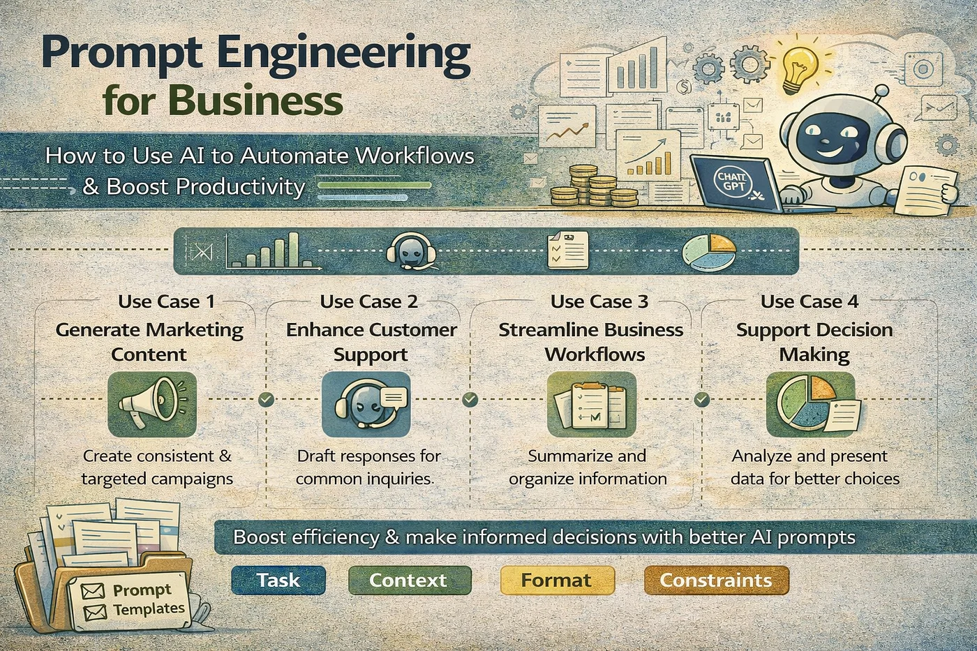 Automating routine business tasks through prompt engineering cuts down on repetitive manual effort, accelerates processes, and reduces human error. It frees employees to focus on creative or strategic work that requires human judgment. Furthermore, AI-driven automation enhances consistency and scalability across operations. Tasks like generating reports, answering customer inquiries, or processing data become faster and more cost-effective when automated properly.